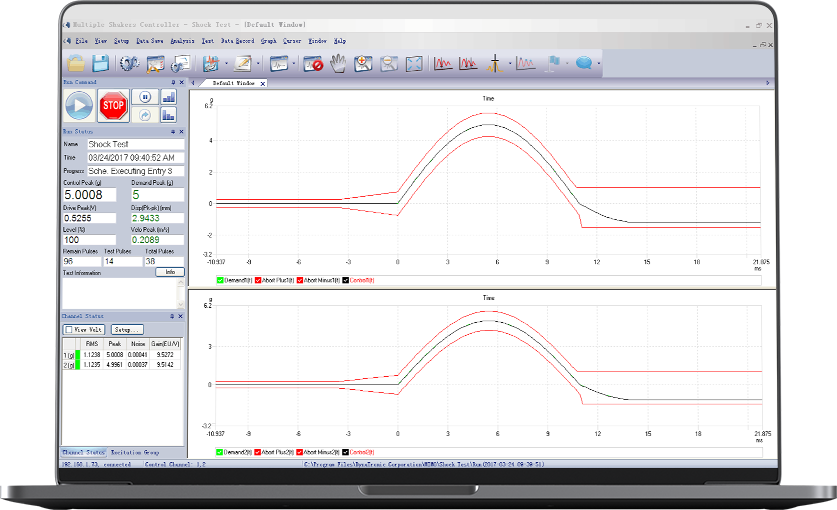The MIMO classical shock test is used used for multiple shaker excitations to act on the same specimen. Multiple control points are arranged on the specimen, and each control point can be set with a different classical shock reference waveform.